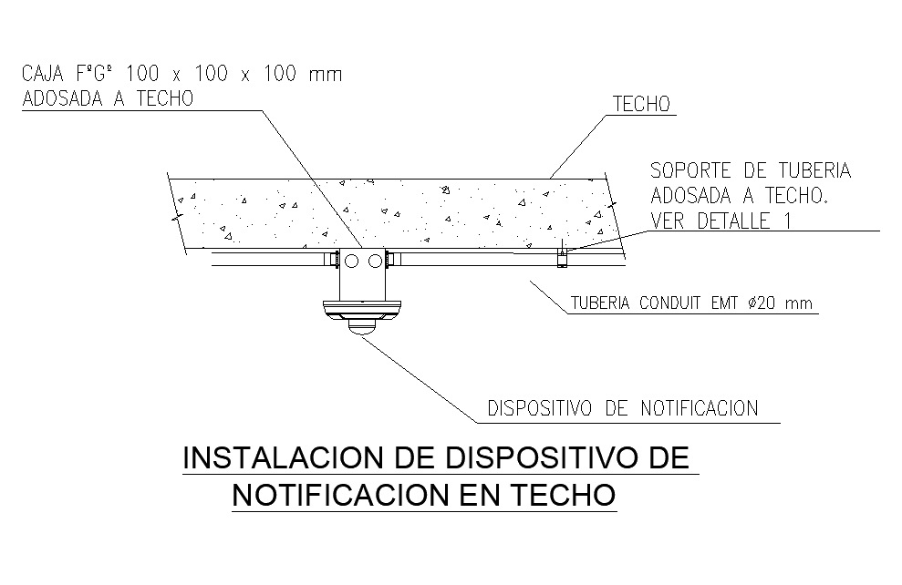 Ceiling notification device installation is given in this Autocad drawing file. This is electrical drawing. 100x100x100mm box attached to false ceiling, notification device, flexible metallic conduit pipe ? 20 mm, emt conduit pipe ?20 mm, false ceiling, pipe support attached to ceiling and other details are given. For more details download the Autocad file. Thank you for downloading the Autocad file and other CAD program files from our website.