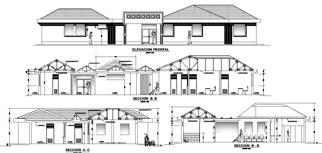 An elevation view of 28x17m hospital building details is given in this Autocad drawing file. This is single story hospital building. Pharmacy, laboratory, waiting hall, reception, doctor consulting rooms, water closet for male & female, patient’s bed and other details are given. For more details download the Autocad file. Thank you for downloading the Autocad file and other CAD program files from our website.