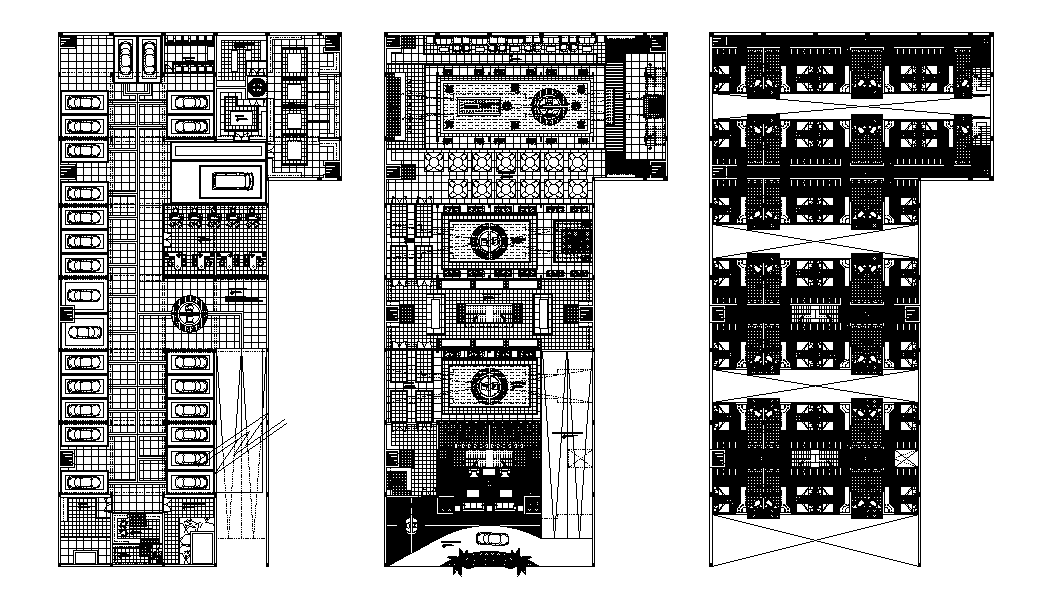 Luxury hotel building plan is given in this Autocad drawing file. This is g+2 hotel building. In the ground floor car parking is available. First & second floor cafeteria, hotel rooms with attached toilet and other details are available. For more details download the Autocad file. Thank you for downloading the Autocad file and other CAD program files from our website.