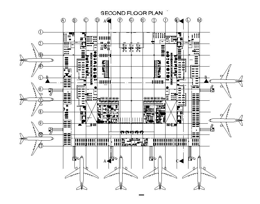 Airport terminal area is separated in this Autocad drawing file. This is the second-floor plan. In the second floor plan, service area, circulation area, information area, telecommunication area, aeronautic office, international office, cafeteria, restaurant, general waiting area, and other details are mentioned. For more details download the Autocad drawing file. Thank you for downloading the Autocad file and other CAD program files from our website.
