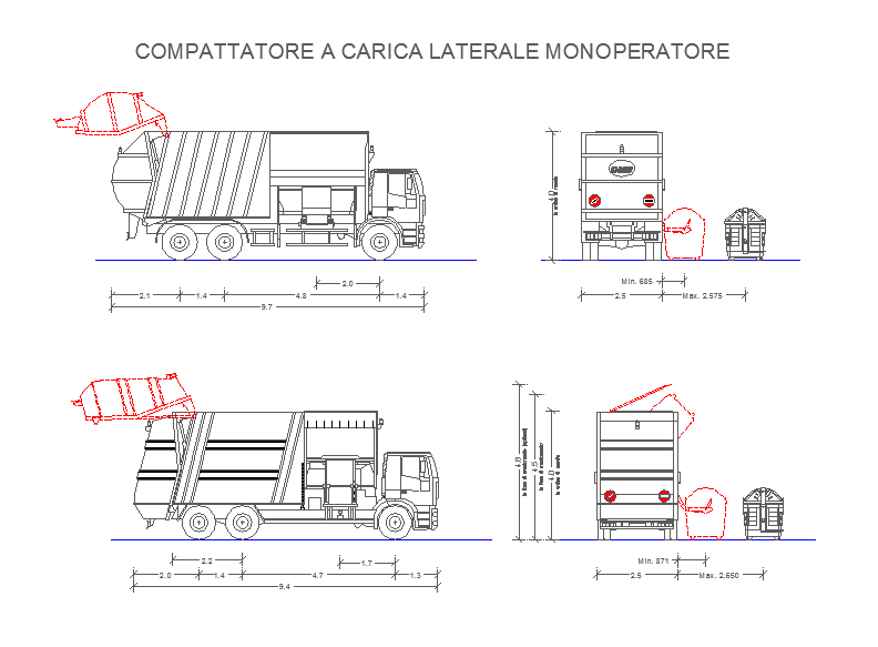 Truck Block Detail in DWG file. compactor mono-side loading, during emptying , plan detail, side elevation, back side view.