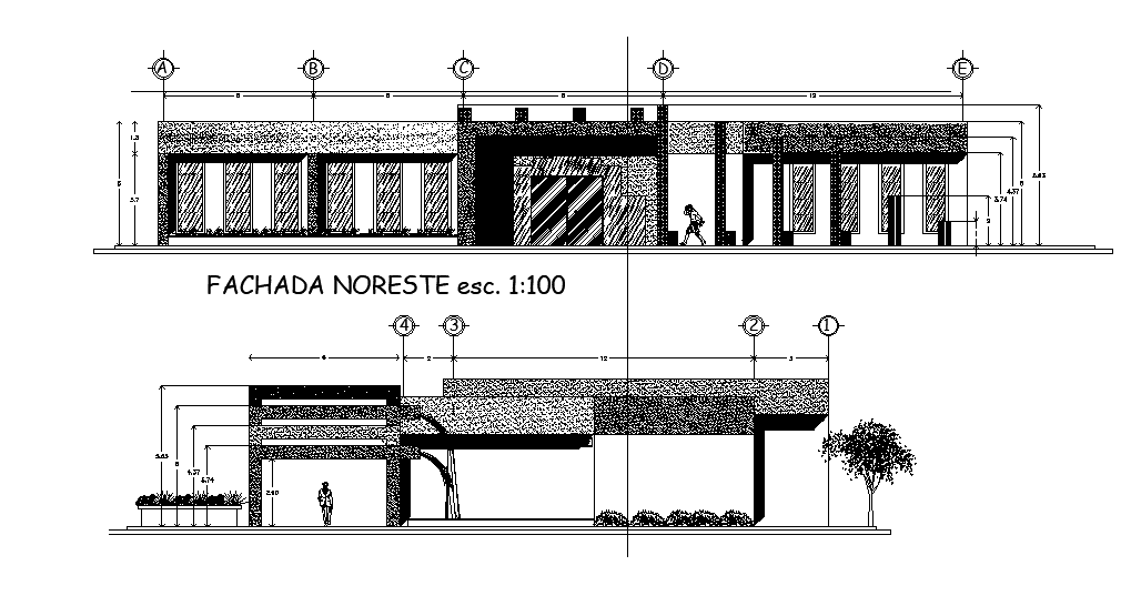 An elevation view of 32x23m seminar hall plan is given in this Autocad drawing file. Download now.