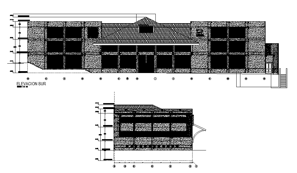 An elevation view of 52x17m architecture office building is given in this Autocad drawing file. Download now.