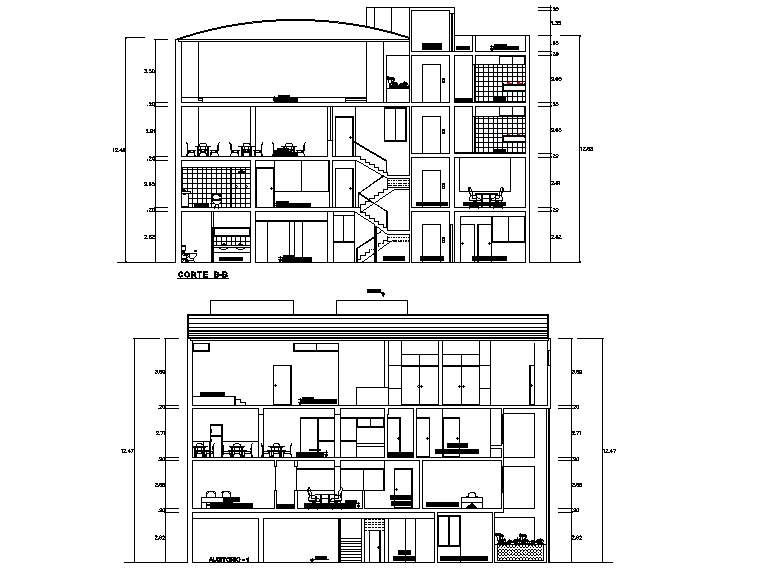13m height of the office building section view is given in this Autocad drawing model. Download now.