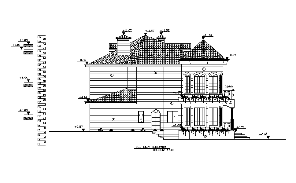 Bungalow right side elevation detail specified in this cad drawing file. Download the AutoCAD drawing file.