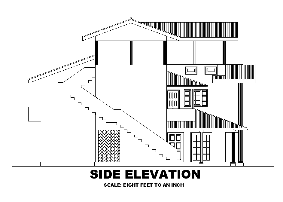 Side elevation of bungalow detail presented in this cad drawing file. Download the AutoCAD drawing file.