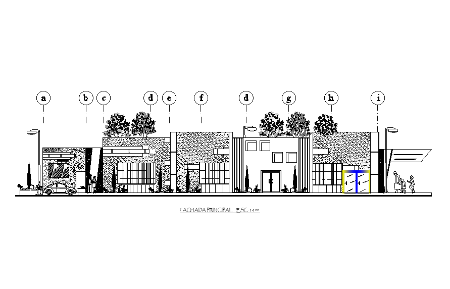 Front elevation view of 58x35m office floor building is given in this Autocad drawing file. Download now.