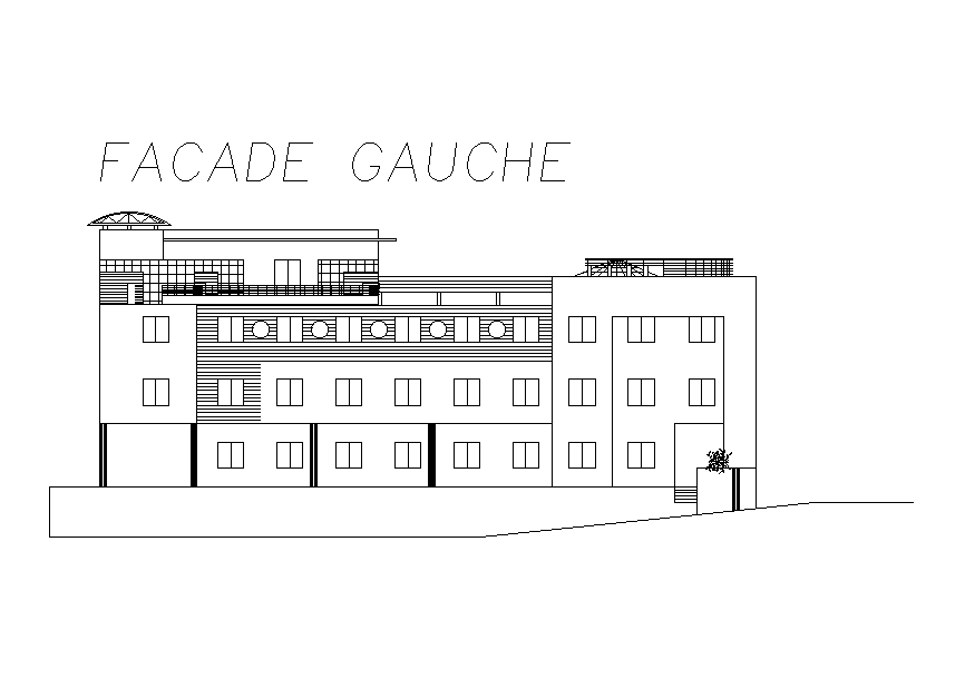 Left side elevation view of 35x33m administration seiege telecommunication office building is given in this Autocad drawing file.