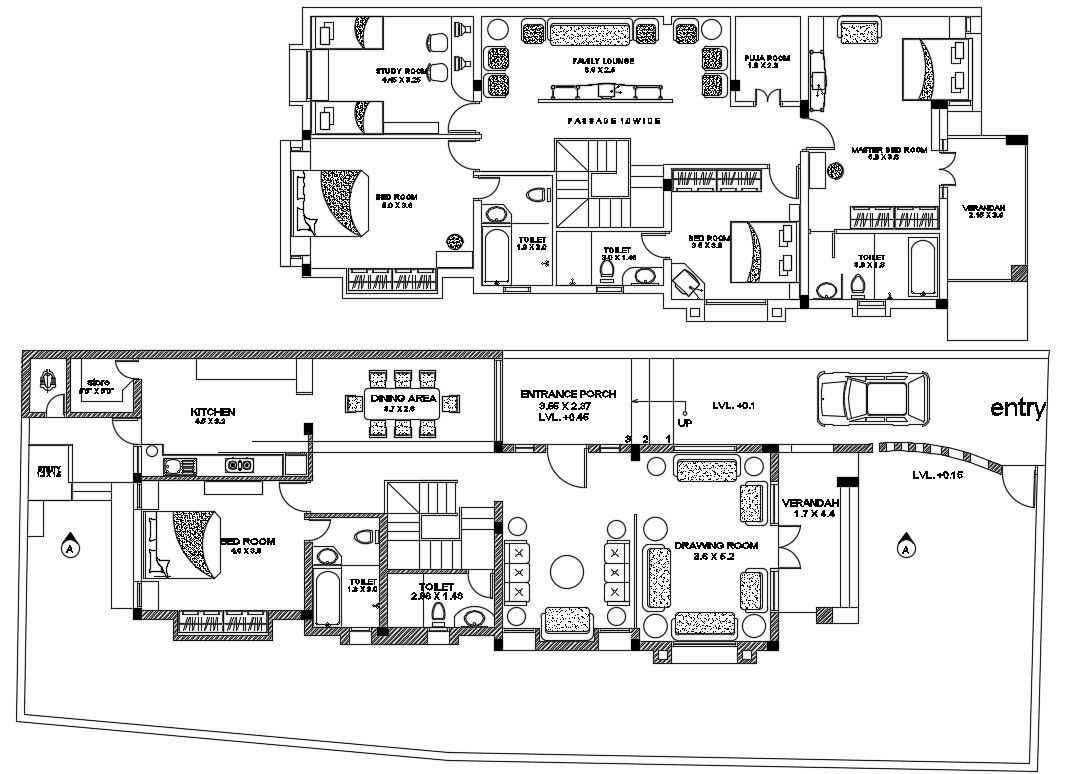 19x10m ground and first floor house plan is given in this Autocad 2D DWG drawing file. This is G+1 house building. In this house, family lounge area, puja room, study room, master bedroom with toilet & bath tub, kid’s room with attached toilet, guest room with attached toilet, verandah and passage is available. For more details download the Autocad file. Thank you for downloading the Autocad file and other CAD program files from our website.