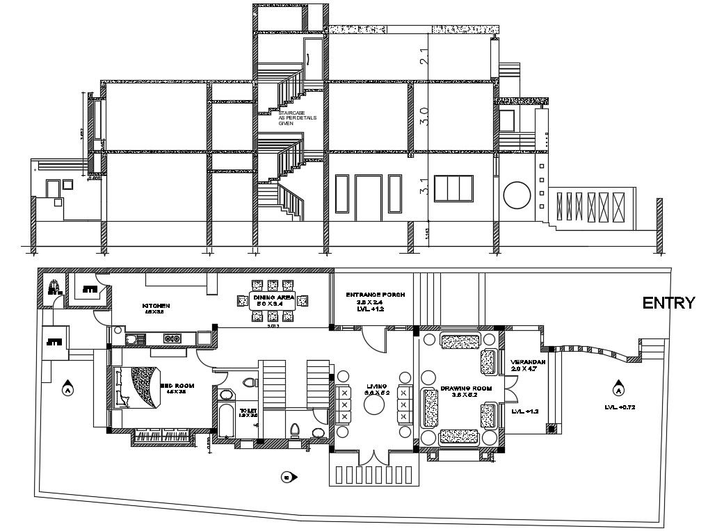 19x10m first floor house plan with section view is given in this Autocad 2D DWG drawing file. Download now.
