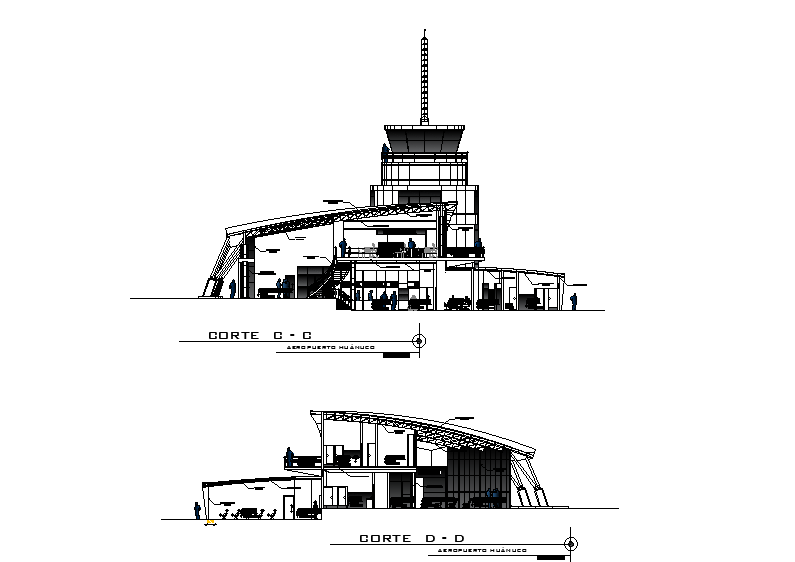 Airport side section detail provided in this file. the ground-floor plan is given in this file. In the ground floor plan, service area, circulation area, information area, telecommunication area, general waiting area, and other details are mentioned. Download this 2d AutoCAD drawing file.