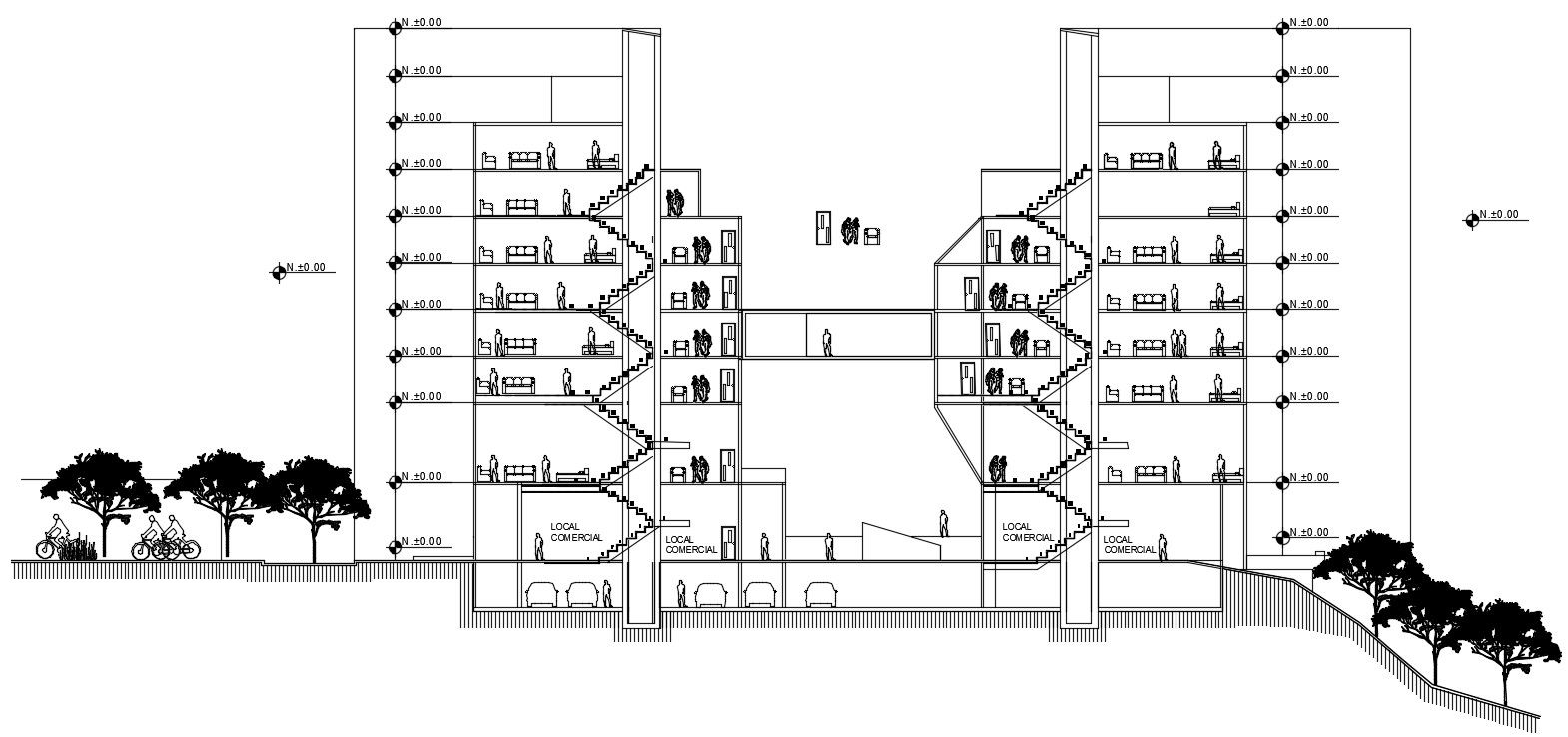 Front section view of the multifamily house building is given in this Autocad drawing file. This is G+7 apartment building. In each floor, 4 houses are available. Ground floor is provided for local commercial shops. These houses are consists of living area, kitchen, dining area, study room, master bedroom with attached toilet, kid’s room and common toilet is available. For more details download the Autocad file. Thank you for downloading the Autocad file and other CAD program files from our website.