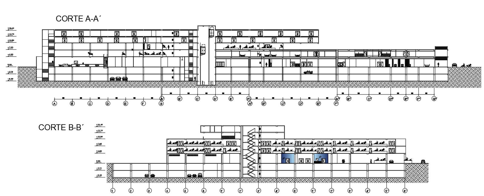 A section view of the hotel cum shopping complex building is given in this Autocad drawing file. Download now.