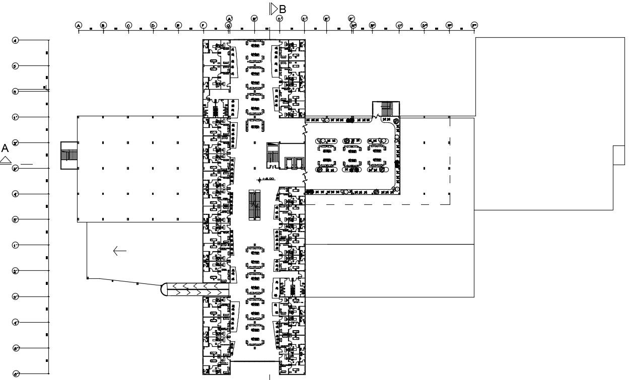 Second floor of 195x167m hospital plan is given in this Autocad drawing file. Download now.