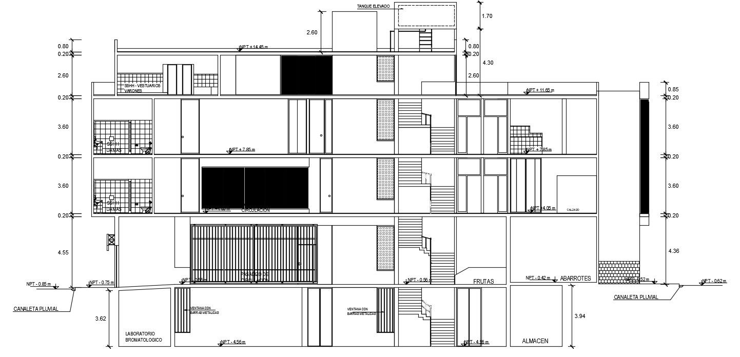 Left side section view of 46x33m food factory building is given in this Autocad drawing file. This is G+2 food factory building. In this, potatoes & grains, fish chamber, food area, chifleria, dining room, condiments, meats and other details are available. For more details download the Autocad file. Thank you for downloading the Autocad file and other CAD program files from our website.