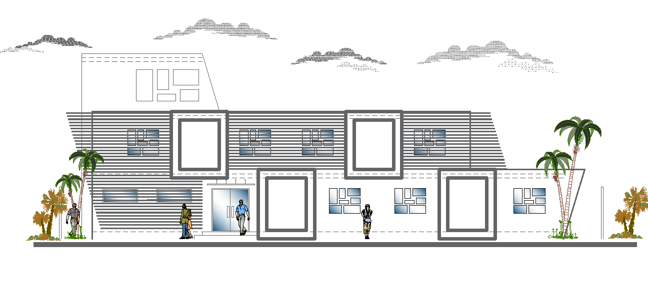 Left side elevation view of 36x26m hotel building is given in this Autocad drawing file. This is G+1 restaurant building. In this plan, the dining area, staying room with attached toilet, reception, admin office, account section, and other details are available. For more details download the Autocad file. Thank you for downloading the Autocad file and other CAD program files from our website.