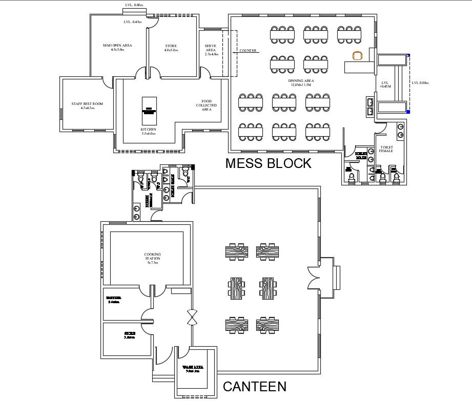 Hostel Room Plan DWG File with Mess Block and Canteen AutoCAD Layout