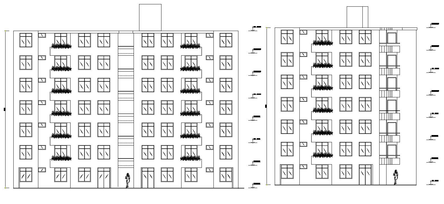 An elevation view of 24x16m apartment building is given in this Autocad drawing file. This is G+6 apartment building. In each floor, two houses are available. These houses are consists of kitchen, dining area, master bedroom, guest room, living hall and common toilet is available. For more details download the Autocad file. Thank you for downloading the Autocad file and other CAD program files from our website.