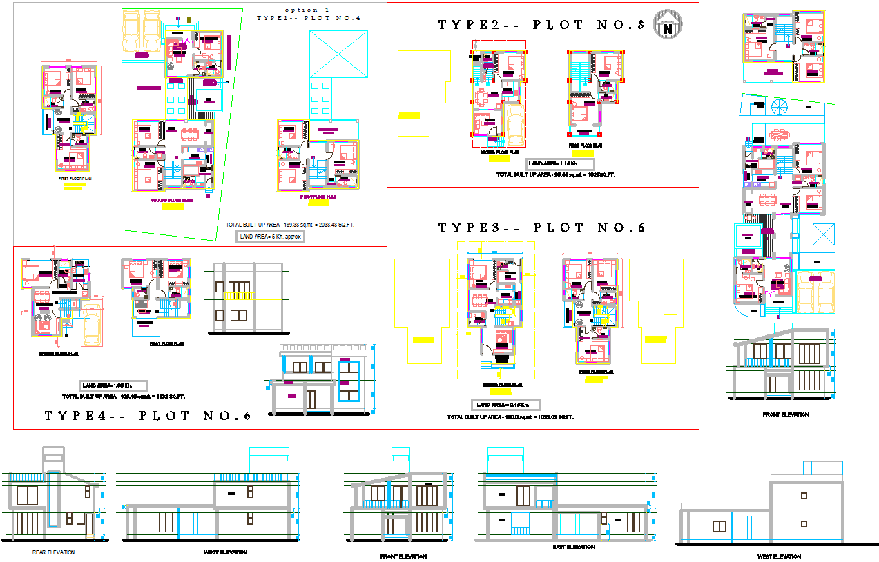 6 type of bungalows architecture plan and elevations. Include sections, elevations, floor plan and detail of architecture.
