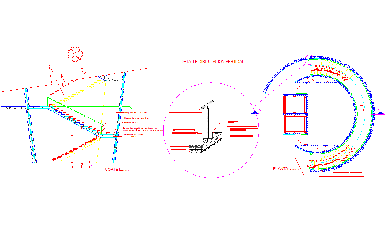 Circular staircase plan and sections dwg. Include floor plan, elevations and sections.