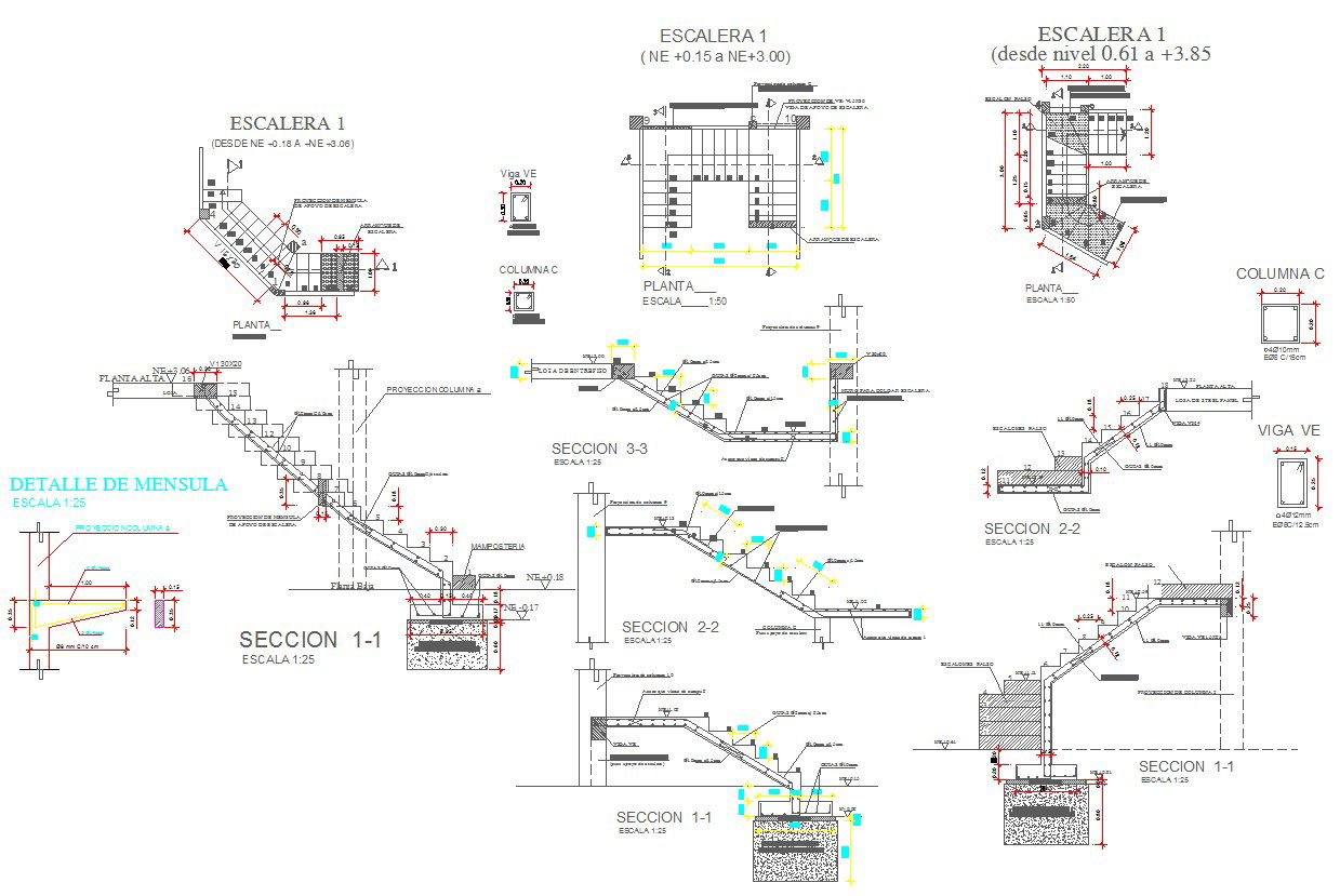 Various type of staircase design and detail cad files. include sections, elevations, plans and sections.