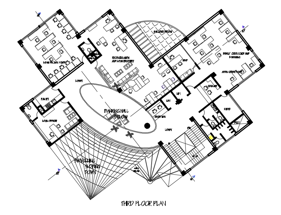 Third-floor plan of the office detail separated in this AutoCAD file. Download this 2d autocad drawing file.
