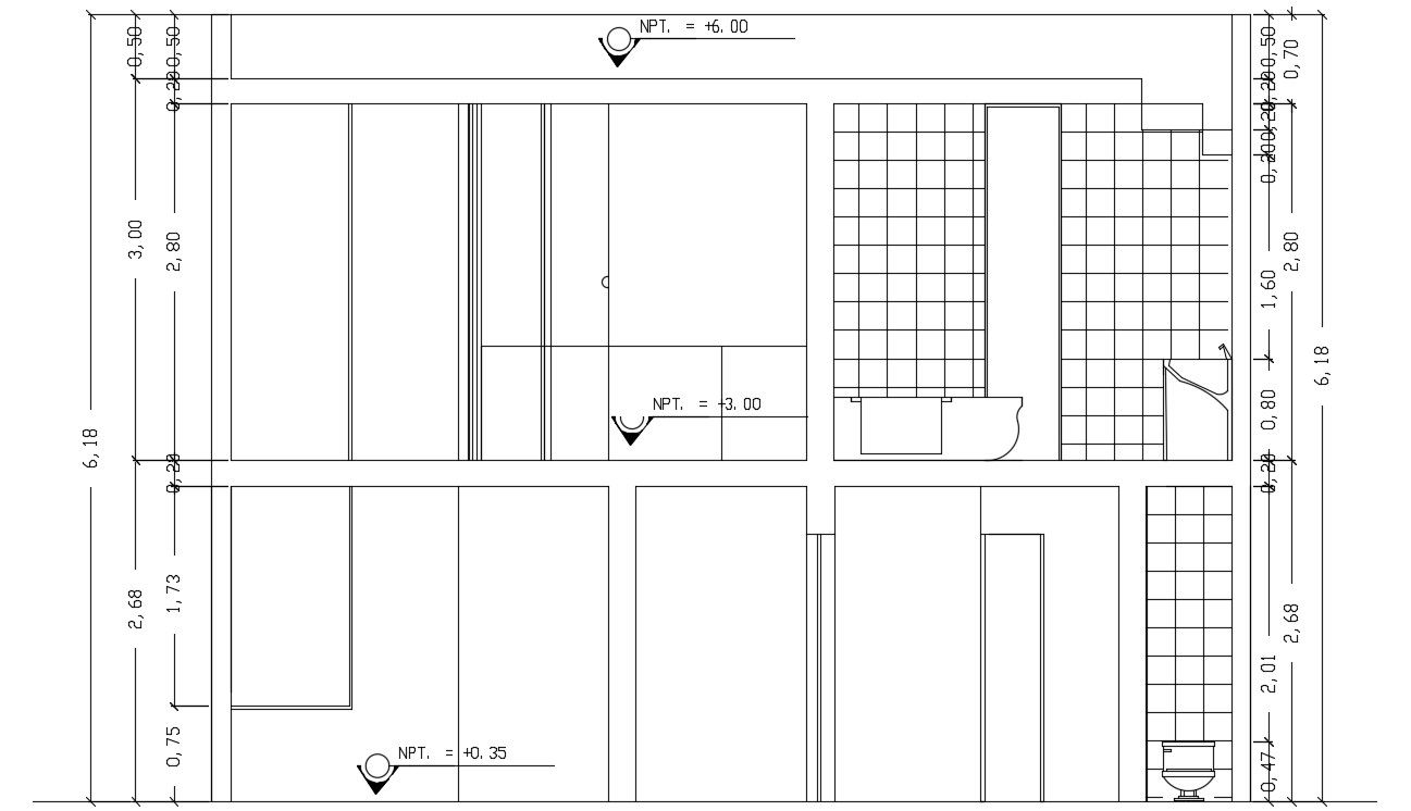 Right side section view of 8x8m home building is given in this Autocad drawing file. Download now.