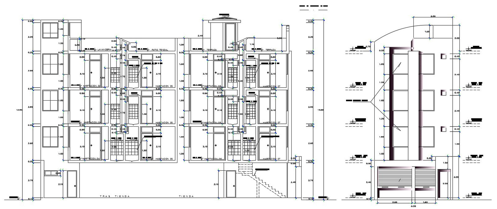 Front section view 6x20m hotel building is given in this Autocad drawing file.  Download now.