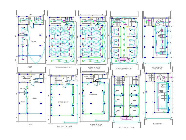 Office electric lay-out detail in autocad file, basement lay-out, ground floor lay-out, first floor lay-out , second floor lay-out & roof detail all floor electric diagram in detail.