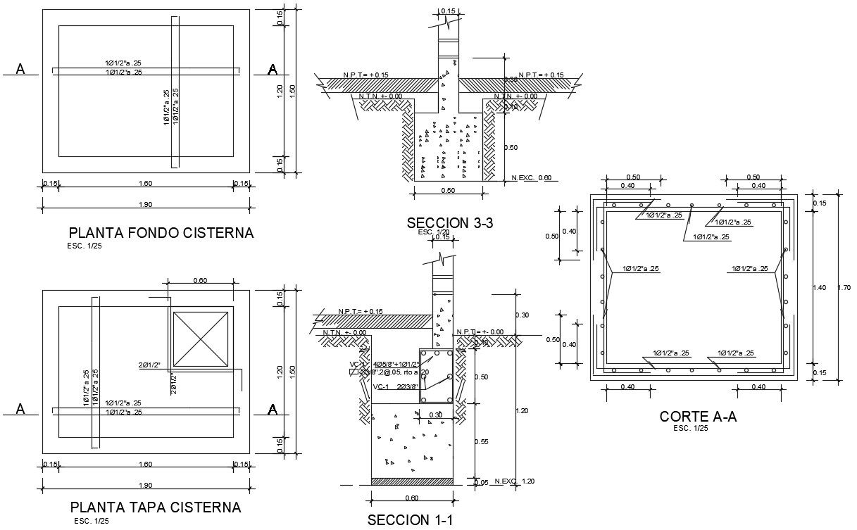 Plan of cisterna is given in this Autocad drawing file. The length and breadth of the cisterna is 1.9m and 1.5m respectively. Section view of the cisterna is given. For more details download the Autocad file. Thank you for downloading the Autocad file and other CAD program files from our website.