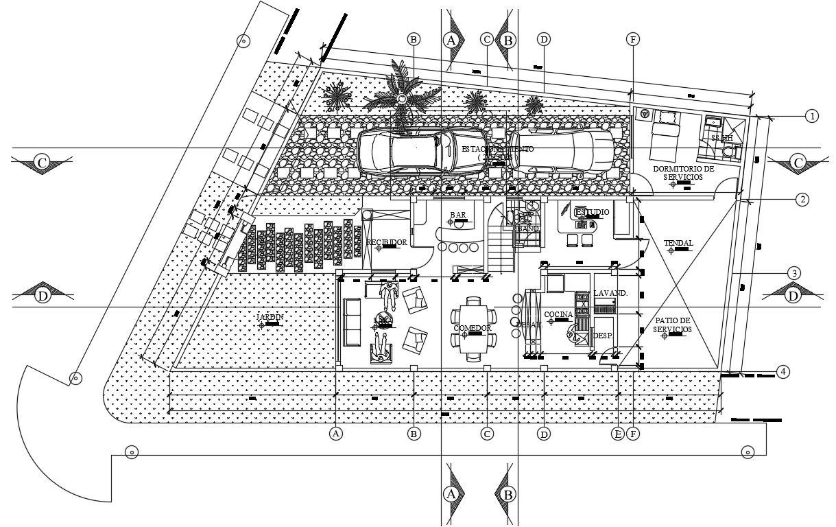 17X13m villa ground floor house plan is given in this Autocad drawing file. This is G+2 villa building. Car parking, kitchen, dining area, living hall, patio services, bar, study room, garden and master bedroom with attached toilet is available. For more details download the Autocad drawing file. Thank you for downloading the Autoad drawing file and other CAD program files from our cadbull website.