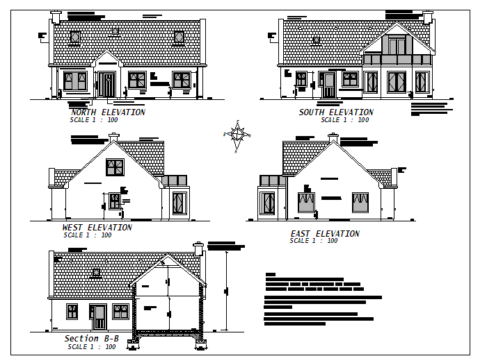 House elevation detail in autocad file, all side elevation detail, North, east, west, south, & section detail.