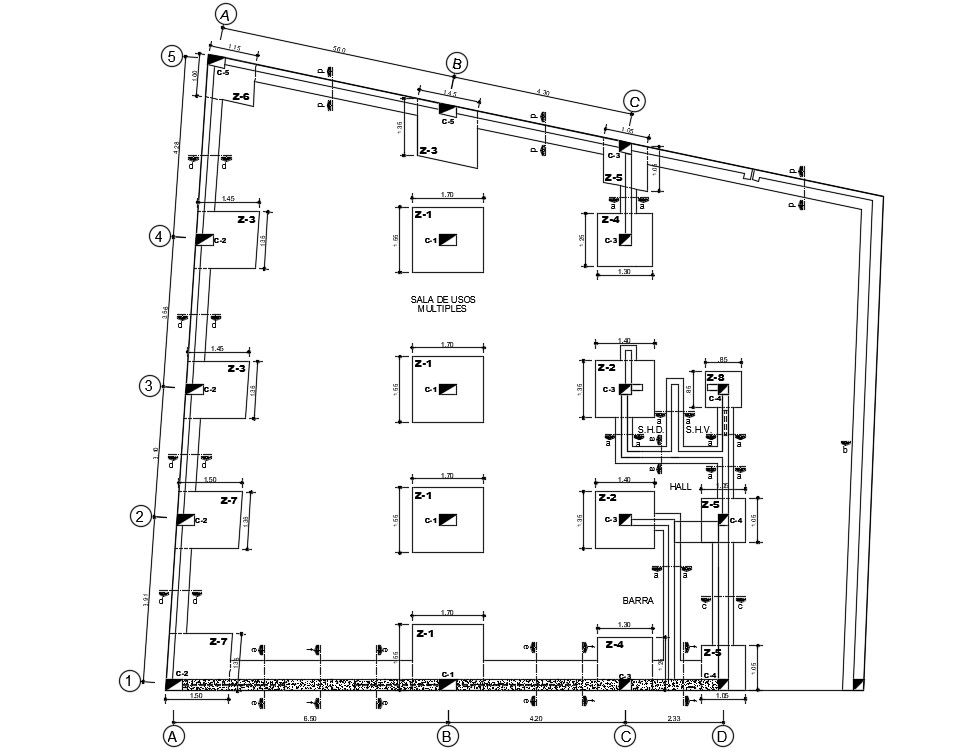 Foundation layout of 17x15m twin house plan is given in this Autocad drawing file. Download now.