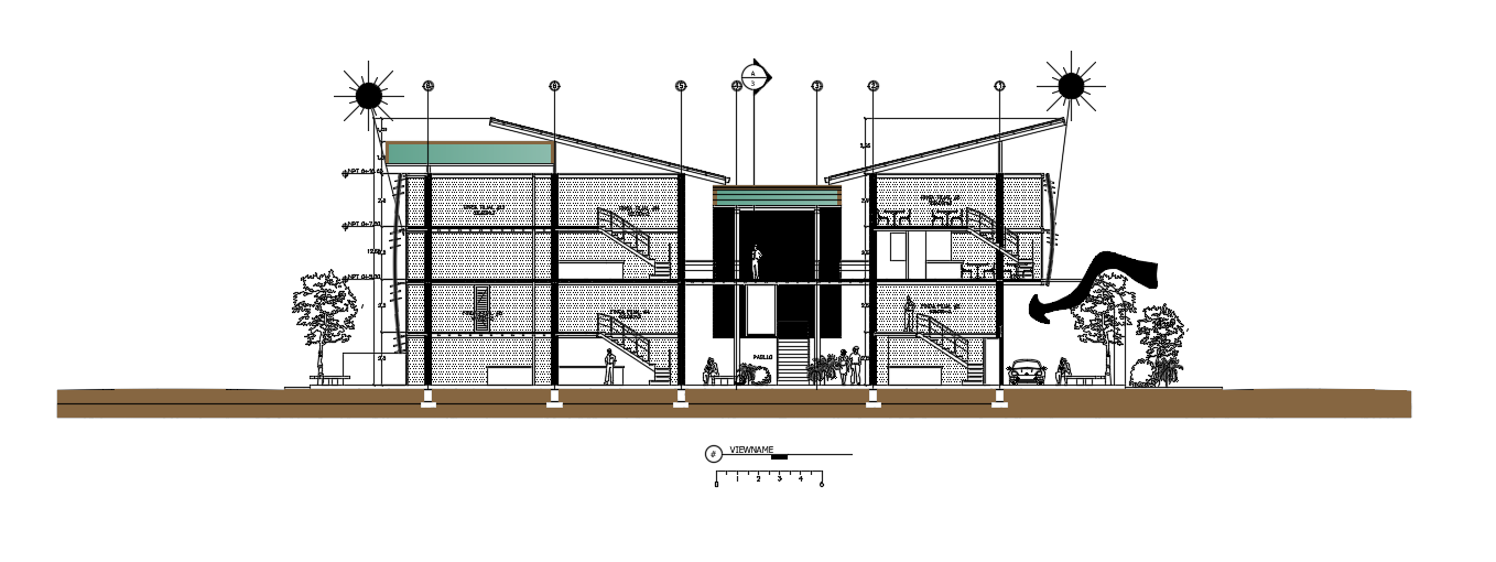 13m height of the shopping building longitudinal section view is given in this Autocad drawing file. Download now.