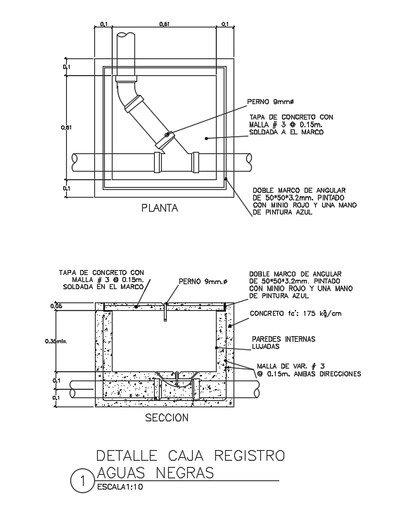 Registration box detail black water is given in this Autocad drawing file. Height of the box is 0.65m. Smooth rod handle, cap level, # 3 rod mesh @ 15cms, interior walls, luxurious hair, 12x 20 x 40 block walls or blasted in concrete, concrete lid with # 2 rod grip other details are mentioned. For more details download the Autocad file. Thank you for downloading the Autocad file and other CAD program files from our website.