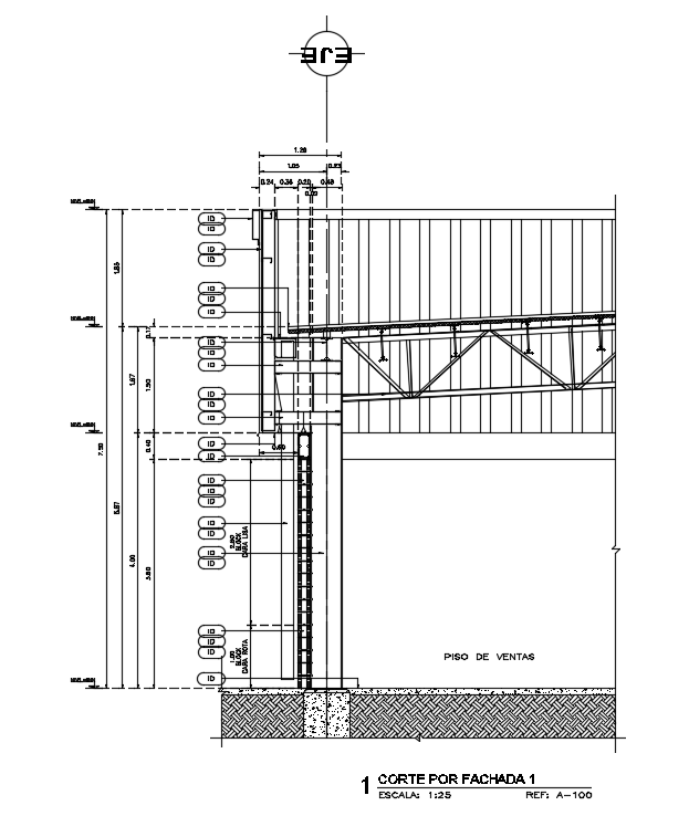 Back side section view of the industrial building is given in this Autocad drawing file. Height of the building is 7.5m. Sales floor is mentioned in this drawing model. For more details download the Autocad file. Thank you for downloading the Autocad file and other CAD program files from our website.