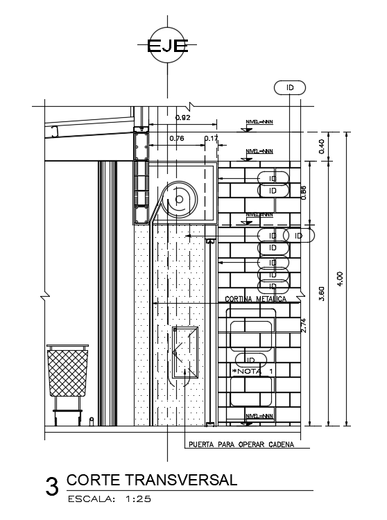 Left side section view of 112x62m super market building is given in this Autocad drawing file. Download now.