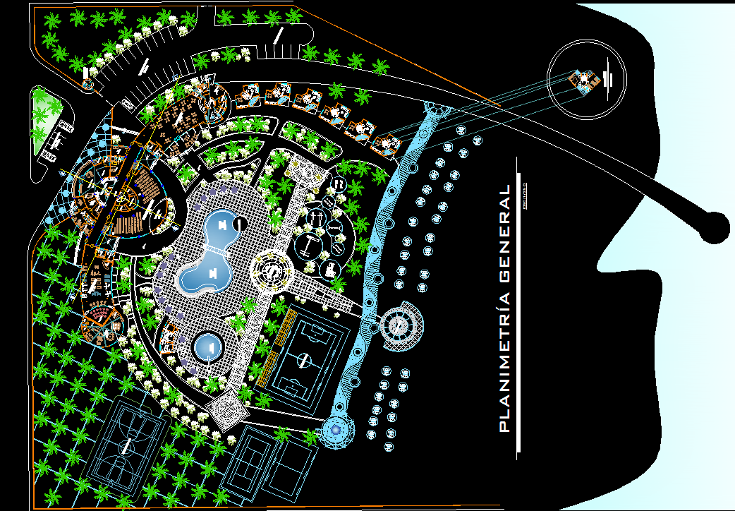 The Hotel Design AutoCAD DWG Drawing presents a detailed master plan for a modern resort or luxury hotel complex. This architectural drawing includes a complete site layout featuring the main hotel building, swimming pools, landscaped gardens, sports courts, parking areas, and a connecting pathway to waterfront facilities. The design is optimized to balance functionality and aesthetics, offering an elegant composition of open spaces and structural zones. The detailed layout ensures efficient circulation, comfort, and a visually appealing outdoor environment.