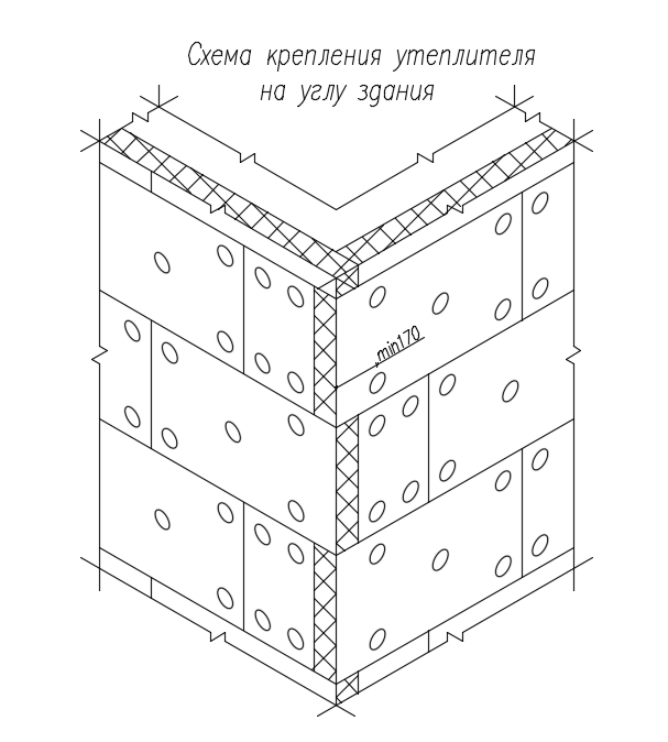 Insulation fastening scheme at the corner of the building is given in this Autocad drawing file. Download now.