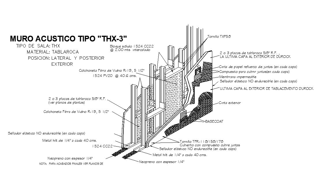 2D Autocad file has the detail of acoustic wall type. This is side and back side view of acoustic wall. Base coat, R 19 Fiberglass Mat, 5 1/2 ", TXP58 Screw, Joints overlapped between layers, Nail and cap, Non-hard enable elastic sealant (in each layer), Joint compound to receive tape, Joint reinforcing paper tape, Joint covering compound (in each layer), Metal hilt 1/4 "every 40 cm, Neoprene 1/4" thick and other details are given in this drawing. For more details download the Autocad drawing file. Thank you for downloading the Autoad drawing file and other CAD program files from our cadbull website.
