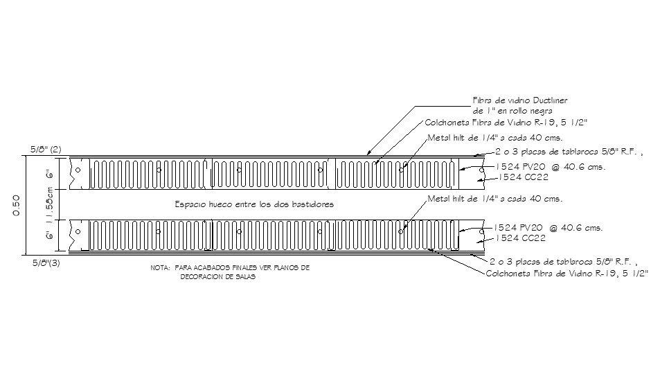 Final decorative plan of acoustic wall plan is given in this Autocad drawing file. Hallow space is provided in between the two racks. R 19 Fiberglass Mat, 5 1/2 ", TXP58 Screw, Joints overlapped between layers, Nail and cap, Non-hard enable elastic sealant (in each layer), Joint compound to receive tape, Joint reinforcing paper tape, Joint covering compound (in each layer), Metal hilt 1/4 "every 40 cm, Neoprene 1/4" thick and other details are given in this drawing. For more details download the Autocad drawing file. Thank you for downloading the Autoad drawing file and other CAD program files from our cadbull website.