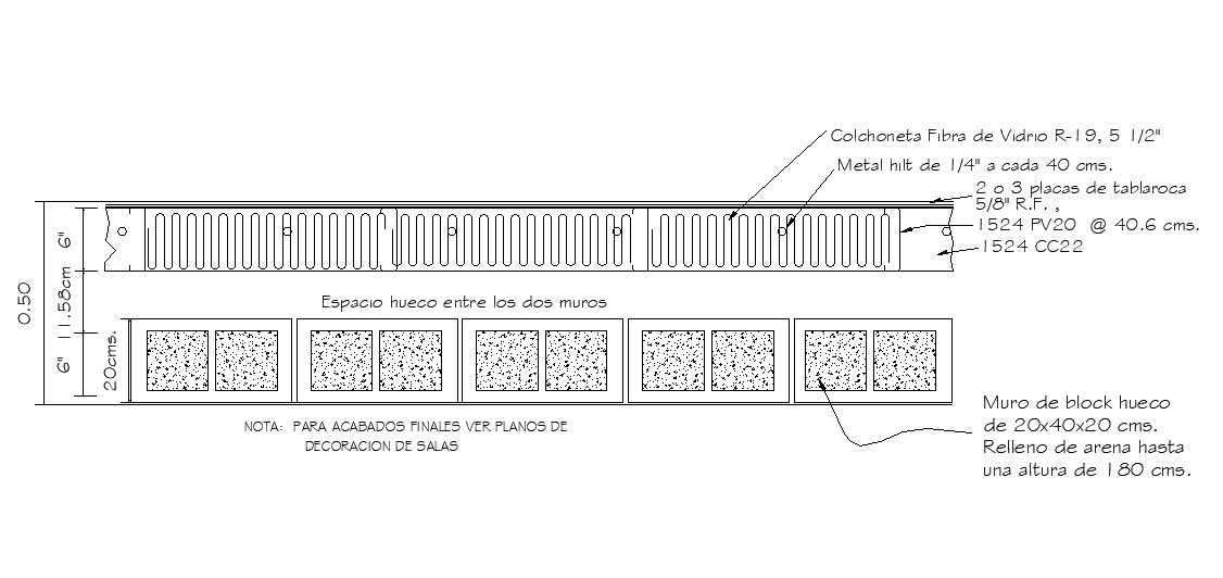 Autocad drawing file has the decorative plan of acoustic wall. Hallow space is provided in between the two racks. R 19 Fiberglass Mat, 5 1/2 ", TXP58 Screw, Joints overlapped between layers, Nail and cap, Non-hard enable elastic sealant (in each layer), Joint compound to receive tape, Joint reinforcing paper tape, Joint covering compound (in each layer), Metal hilt 1/4 "every 40 cm, Neoprene 1/4" thick and other details are given in this drawing. For more details download the Autocad drawing file. Thank you for downloading the Autoad drawing file and other CAD program files from our cadbull website.