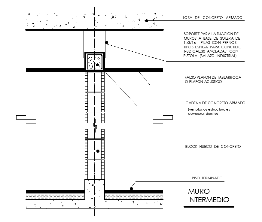 Intermediate wall of acoustic wall is given in this Autocad drawing file. Concrete hollow block is provided. Reinforced concrete slab, support for fixing 1 x3 / 16 floor walls, pins with bolts types of concrete t-32 cal.38 anchored with gun (induztrial bullet), false roof panel ceiling or acoustic ceiling, armed concrete chain, concrete hollow block, finished floor and other details are given in this drawing. For more details download the Autocad drawing file. Thank you for downloading the Autoad drawing file and other CAD program files from our cadbull website.