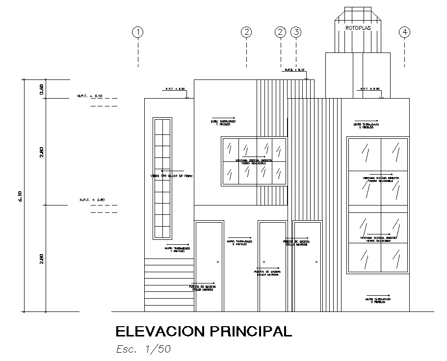 Front elevation view of 8x35m office cum house building is given in this Autocad drawing file. Download now.