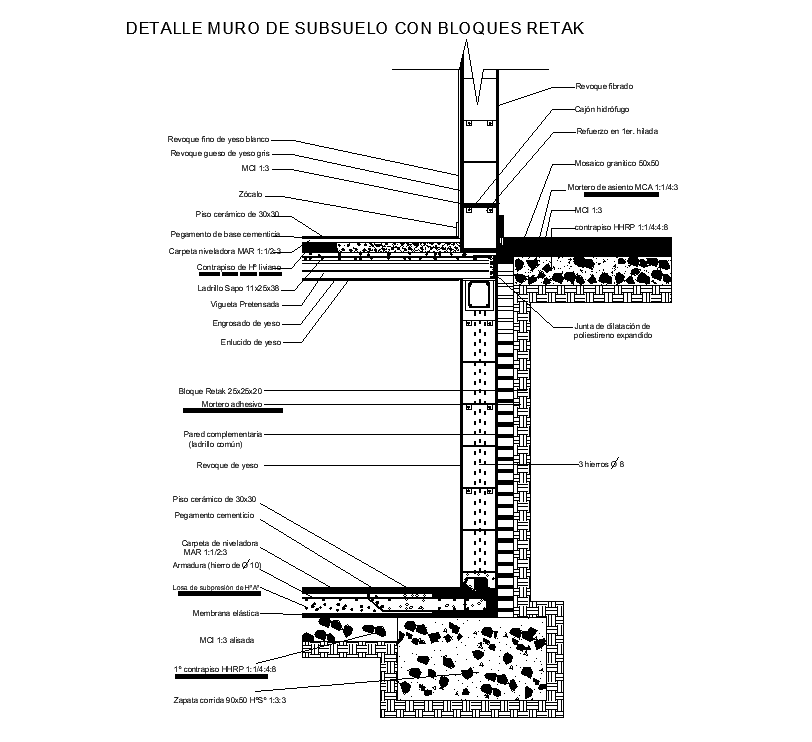 Subfloor wall detail with retak blocks detail is given in this Autocad drawing file. This is construction drawing. Fine white plaster plaster, Thick gray plaster, 30x30 ceramic floor, Cement based glue, MAR 1: 1/2: 3 leveling pad and other details are mentioned. For more details download the Autocad drawing file. Thank you for downloading the Autoad drawing file and other CAD program files from our cadbull website.