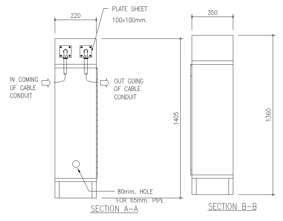 A section view of fire protection is given in this Autocad drawing model. The size of pipe is 65mm. Incoming cable, outgoing cable and plate sheets are specified in this drawing model. For more details download the Autocad drawing file. Thank you for downloading the Autoad drawing file and other CAD program files from our cadbull website.
