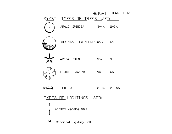 Tree Block detail in DWG file, top plan view, street light, dimension detail with symbol type of different.