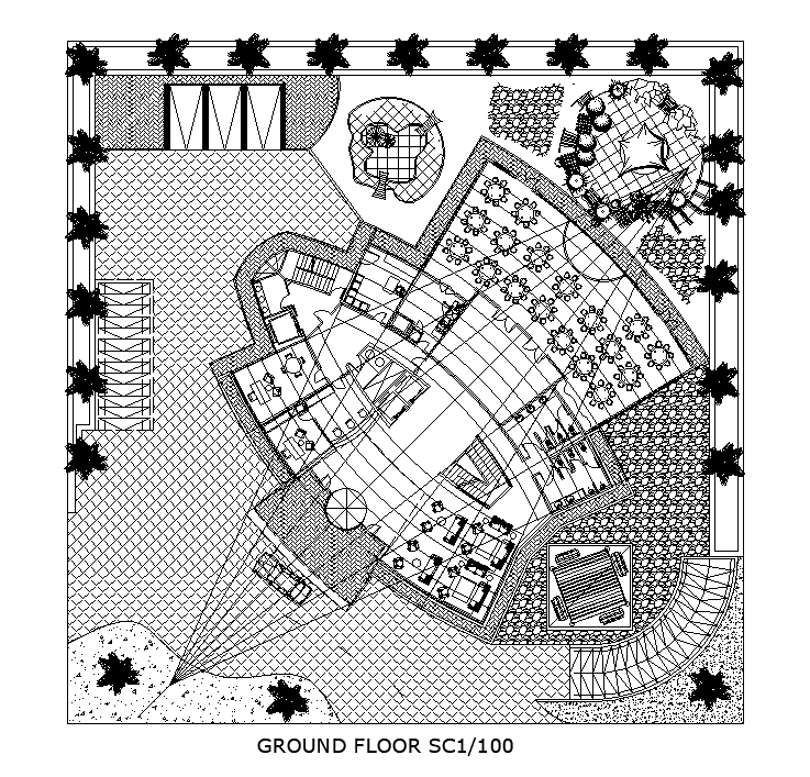 Ground floor plan of the star hotel is given in this Autocad drawing file. Download now.