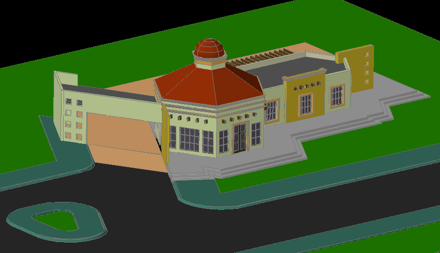 The 3D Traditional Restaurant AutoCAD DWG Drawing showcases a beautifully modeled restaurant structure featuring classical design elements and a distinctive octagonal dome roof. This file presents a fully rendered 3D layout that highlights the spatial arrangement, entrance design, seating area planning, and roof detailing. The architectural composition combines traditional aesthetics with modern functionality, making it ideal for concept visualization and professional presentations.