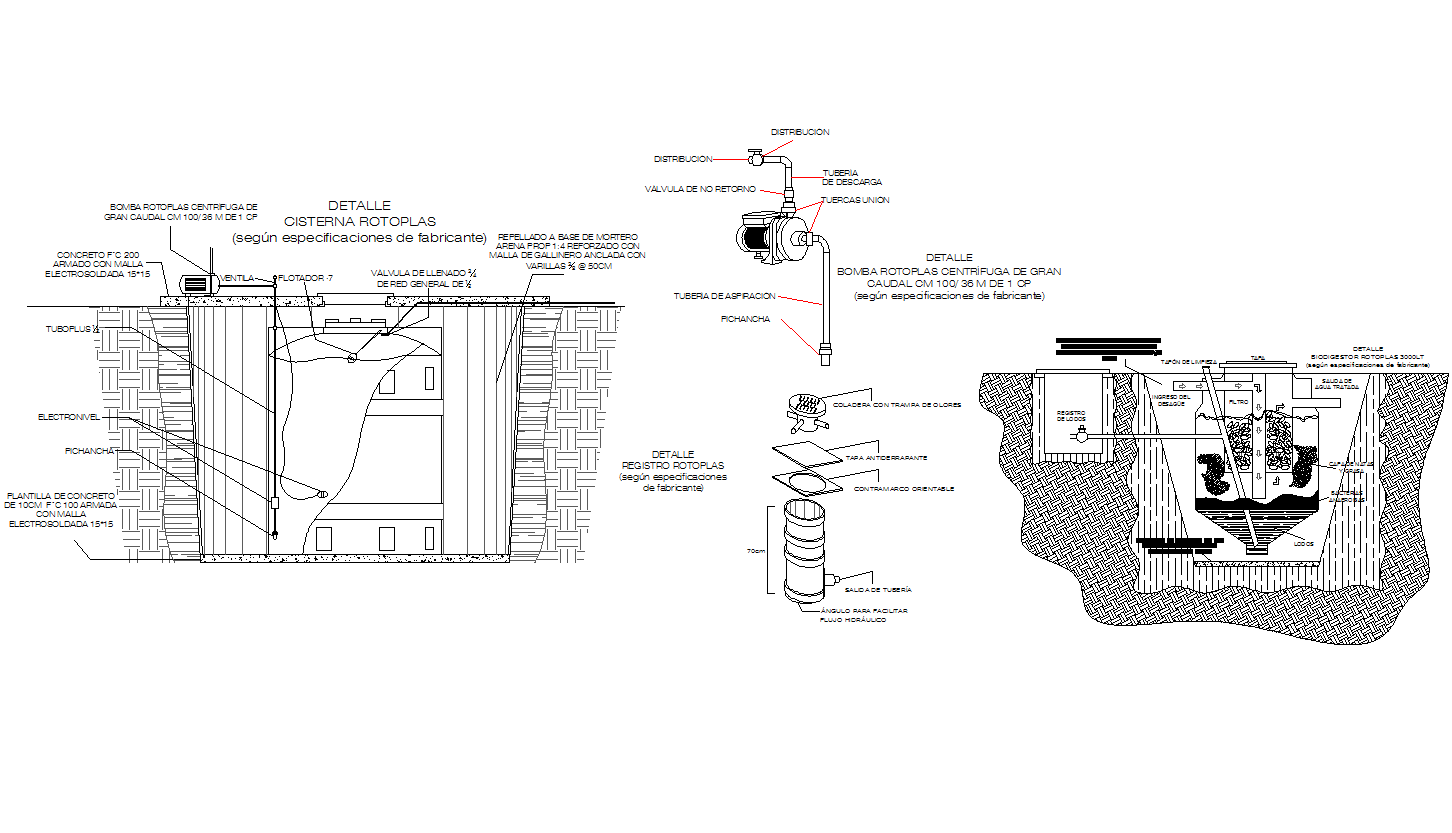 Underground water drainage tanks. Repellant based on mortar sand prop 1: 4 reinforced with chicken net anchored with rods 3/8 @ 50cm. detail Biodigestor rotoplas 3000lt (According to manufacturer specifications), mold concrete 5cm f'c 100 armed mesh electro 15 * 15.